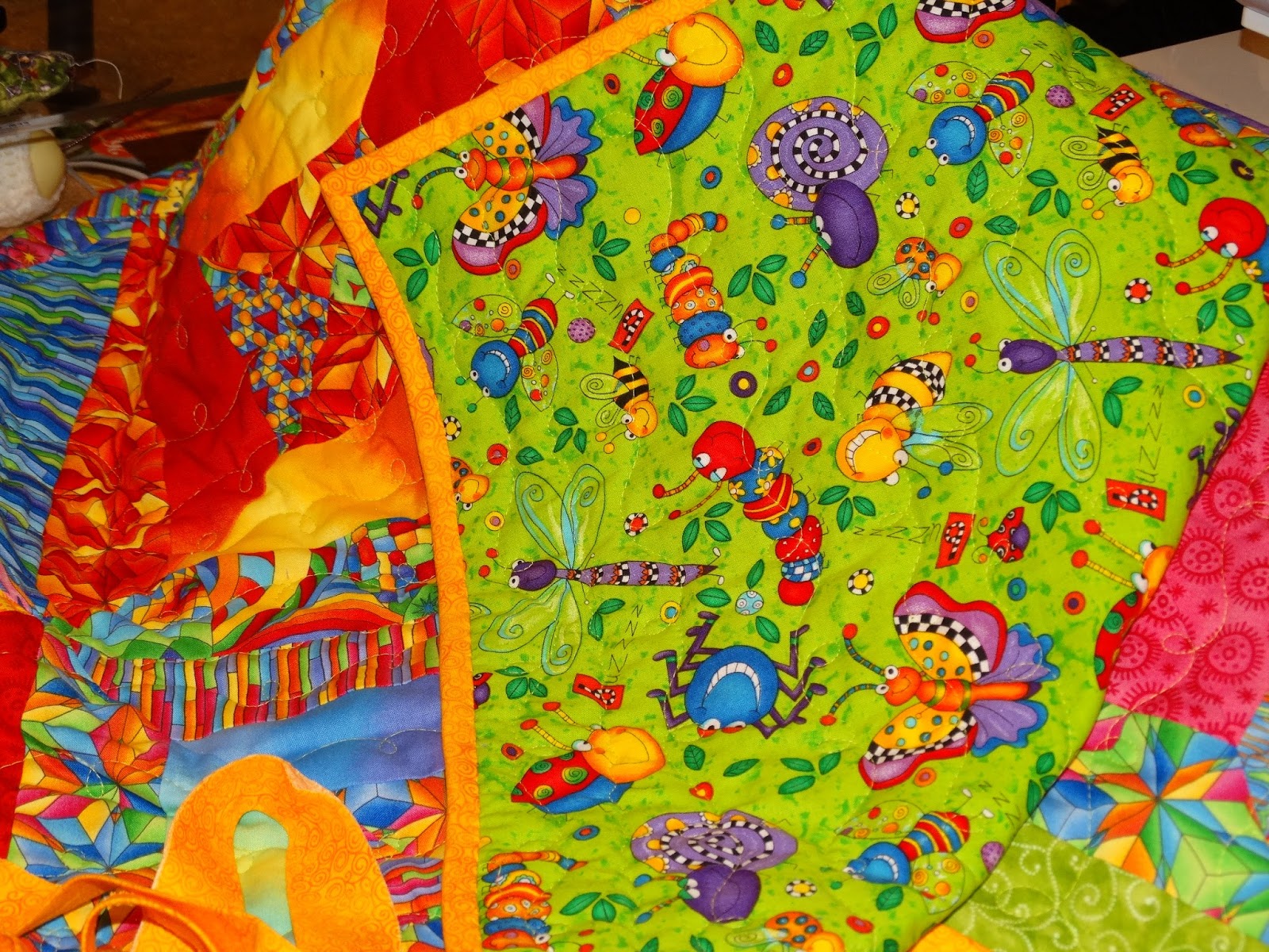 After I took her home, I came to my house and got ready for the quilt group and did some cleaning while I ate a quick supper. During the quilt time, I worked on the quilt I started putting binding on yesterday. I am now about 1/2 way around the quilt.